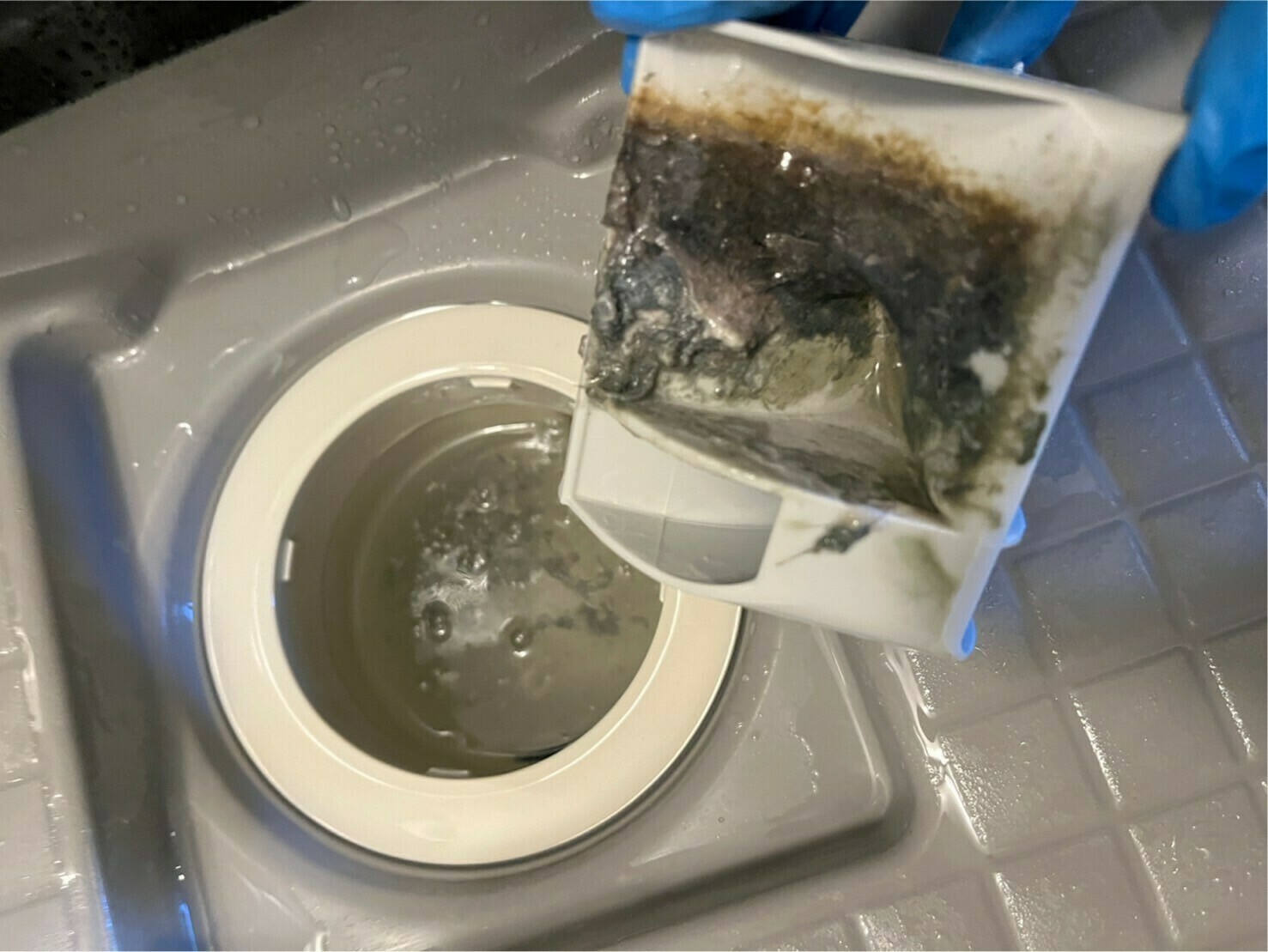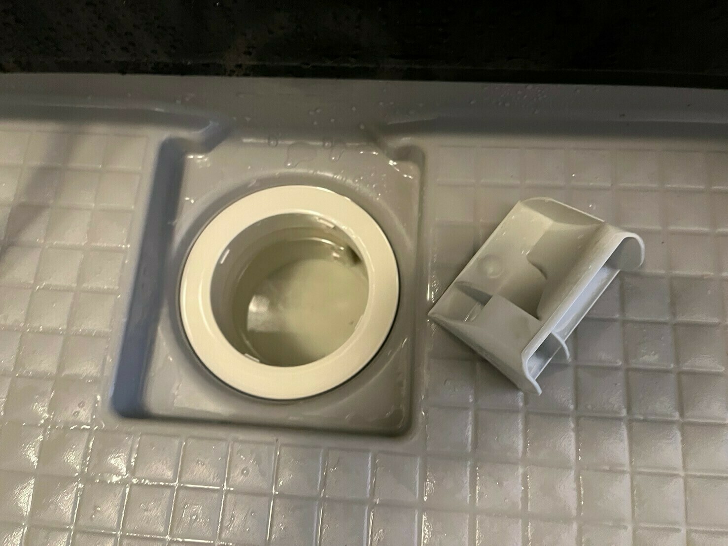排水口の中は、石鹼カス汚れと皮脂汚れでぬめりがついていますね…