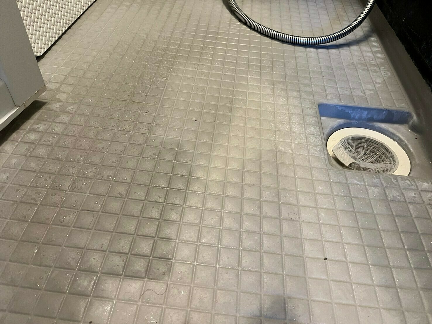 浴室の床は、黒カビ汚れがついている箇所や、髪の毛が落ちていますね💦