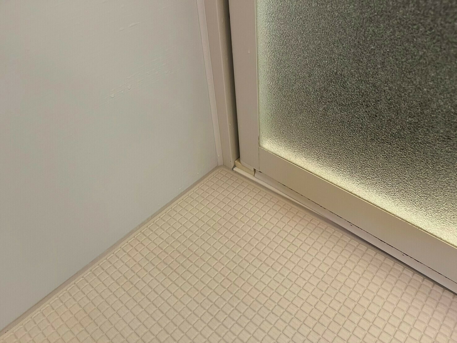 浴室と脱衣所の境目の扉のサッシ部分には石鹼カス汚れや皮脂汚れが蓄積した黒カビが発生しています😱