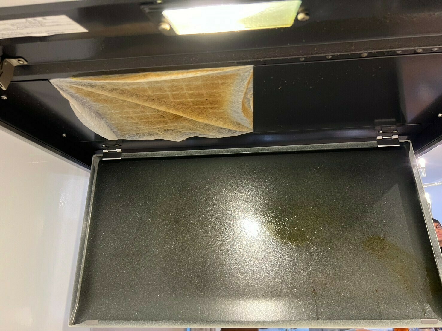 レンジフードの整流板を外すと、ハチミツのような油汚れがついていますね😱