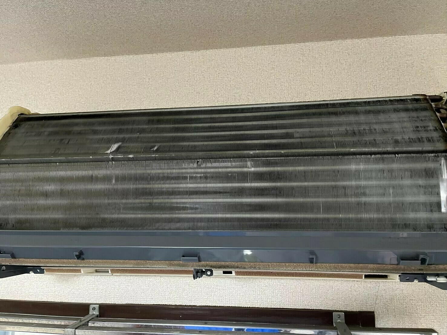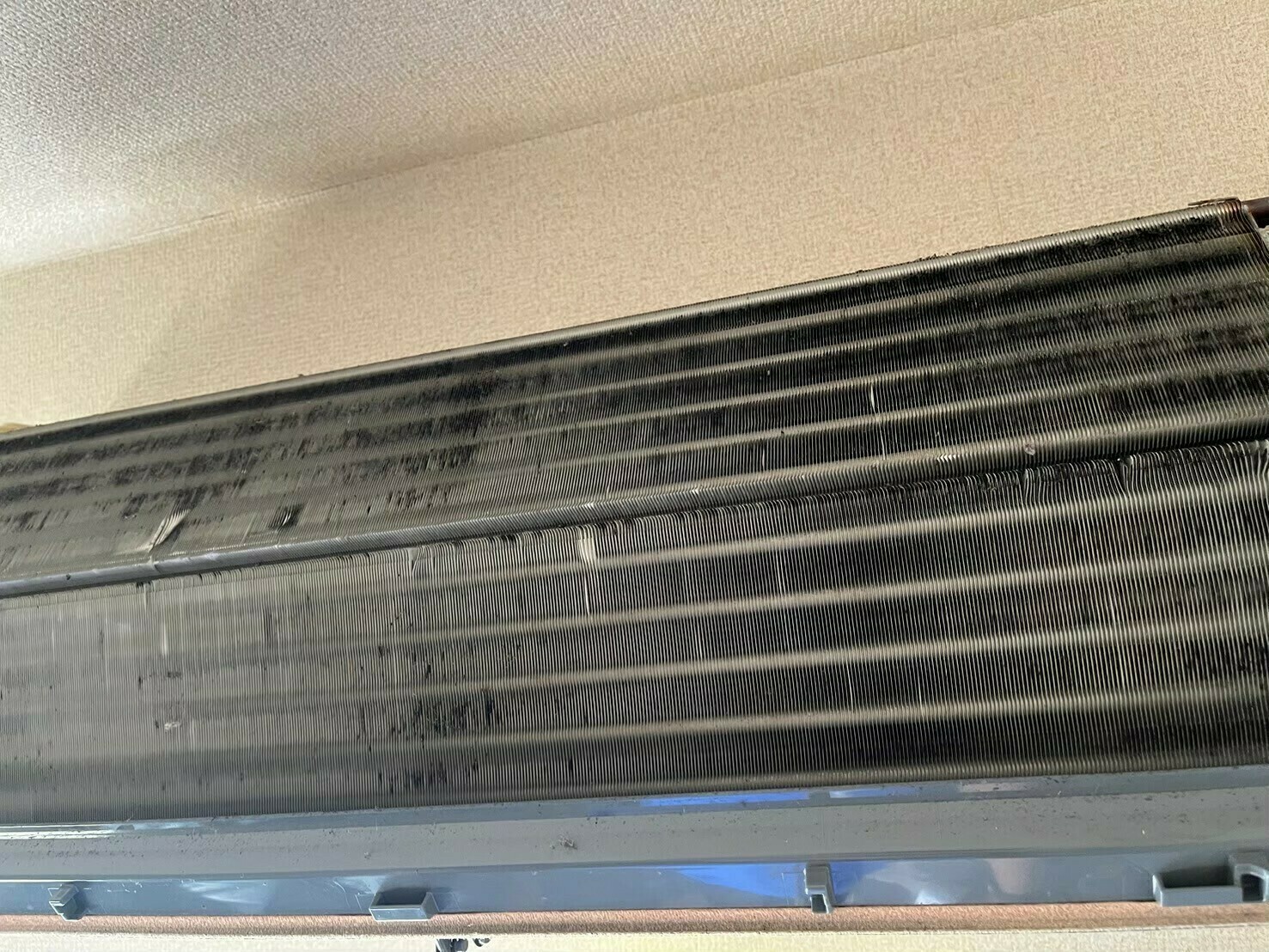 フィルターを外すと、アルミフィンには黒カビ汚れが上の方はびっしり真っ黒になっています😱😱