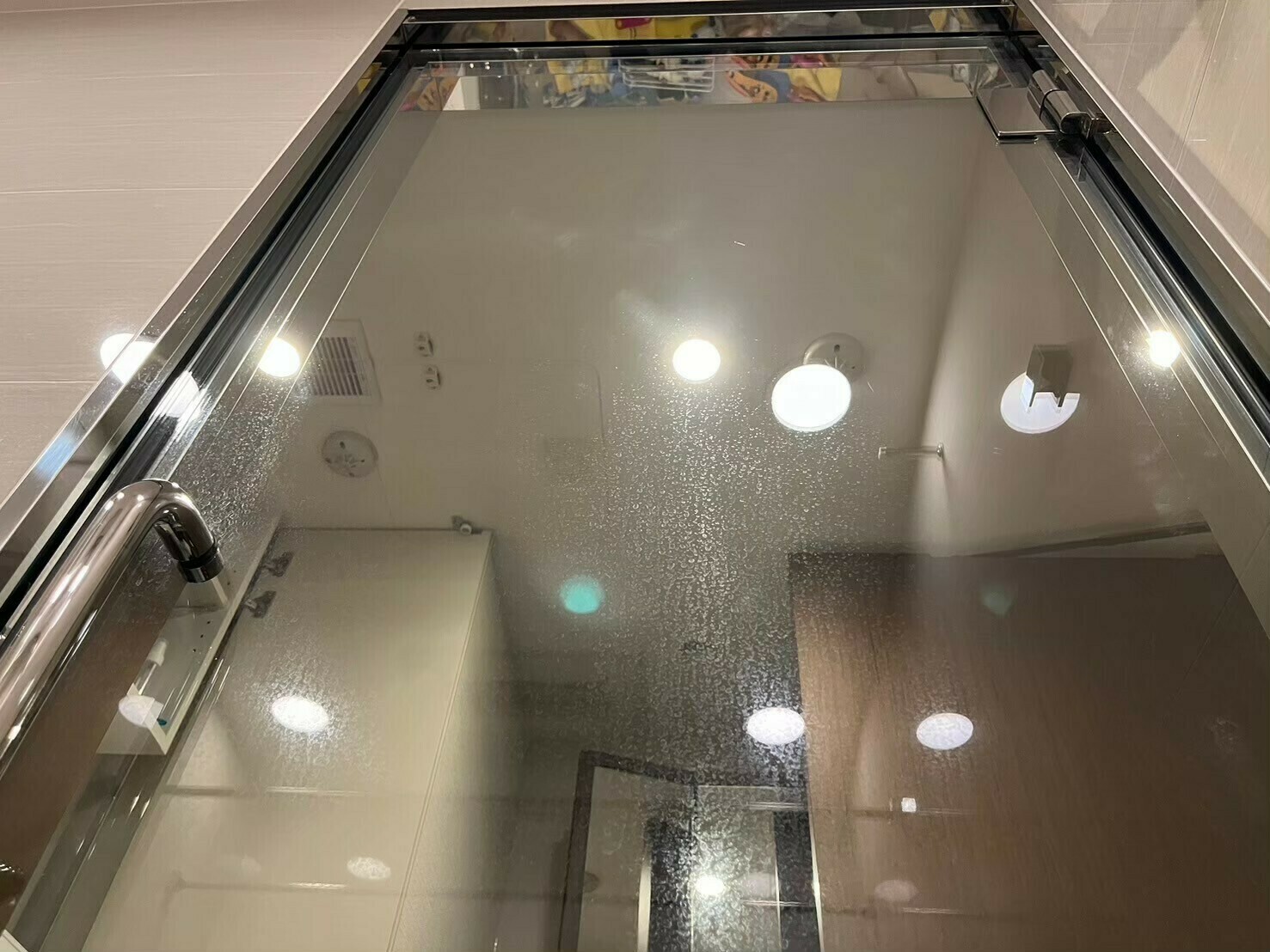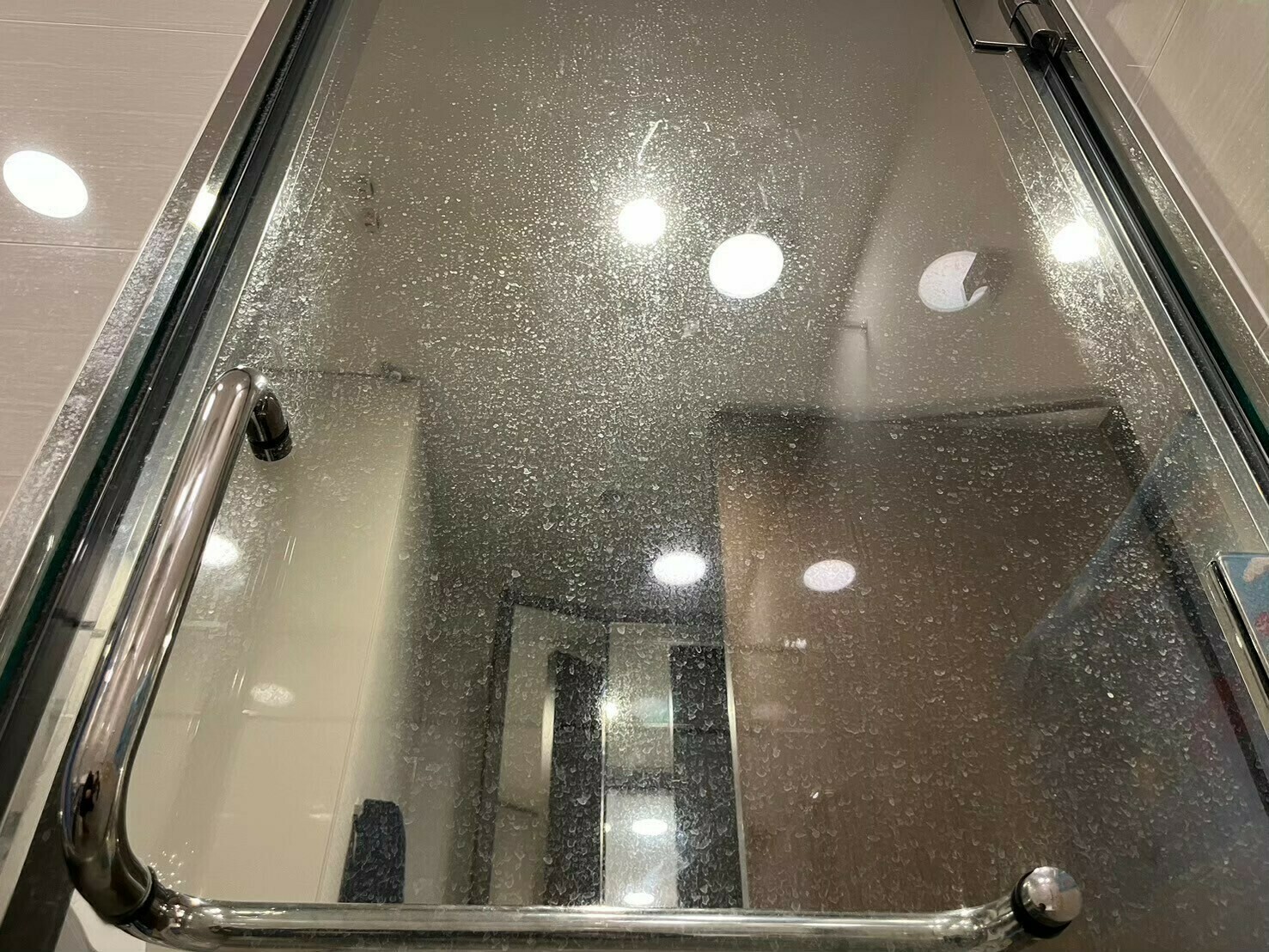 ガラスのおしゃれな扉は、ウロコ汚れ・カルキ汚れでいっぱいになっていますね💦